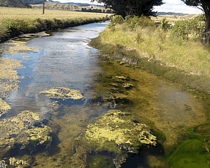 Is a taxon of green algae that likes clear eutrophic water and has become a pest in New Zealand. Mats of this noxious aquatic algae can form extensive mats that clog stream flow and deplete oxygen levels through respiration at night time. As the mat grows the top layer can die and decay causing further depletion of stream oxygen levels. Water net is commonly found in open stream environments that lack riparian cover.